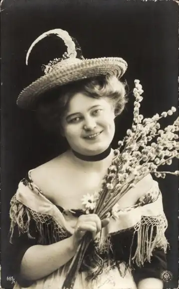 Ak Porträt einer Frau, Blumen, Hut mit Federn, Tracht