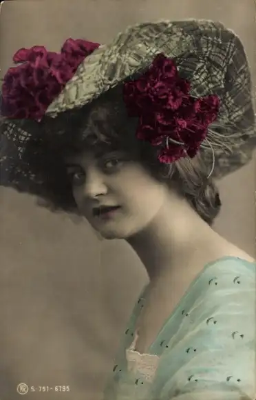 Ak Porträt einer Frau in blauem Kleid, Hut