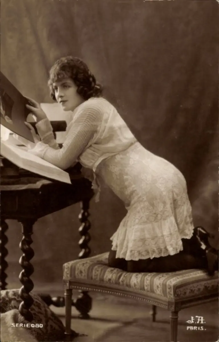 Ak Porträt einer Frau in weißem Kleid, Buch, Hocker
