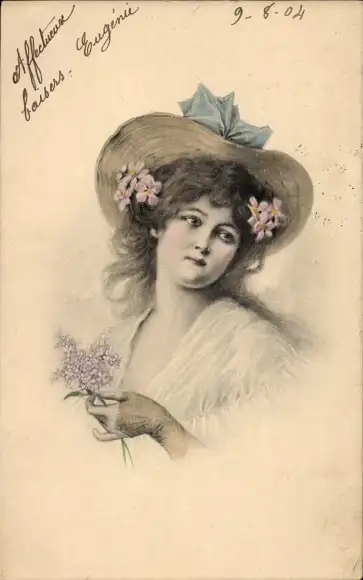 Ak Porträt einer jungen Frau, Hut, Blumen