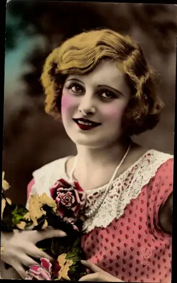 Ak Porträt einer jungen Frau, Perlen, Blumen