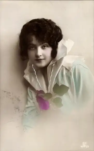 Ak Porträt einer jungen Frau, Rose, Blaue Bluse
