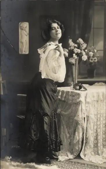 Ak Porträt einer jungen Frau, Schwarzer Rock, Blumen, Blumenvase