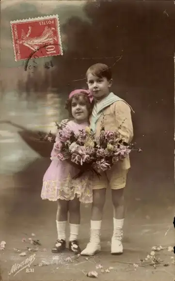 Ak Portrait, Junge und Mädchen mit Rosensträußen