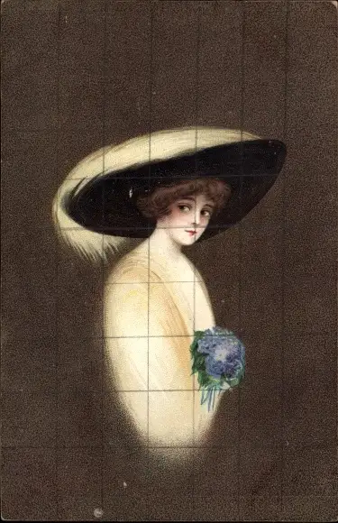 Ak Portrait einer Frau, Hut mit Federn, Blumen