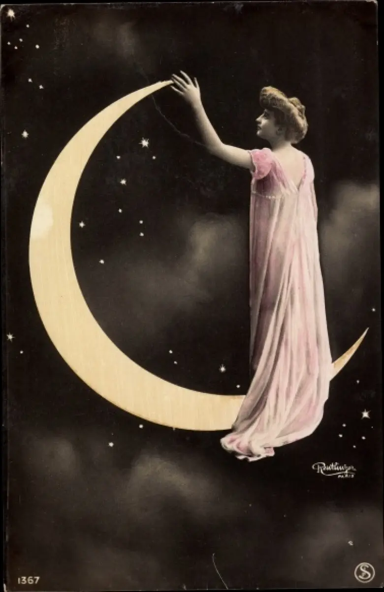 Ak Portrait einer Frau, Mondsichel, Sternenhimmel