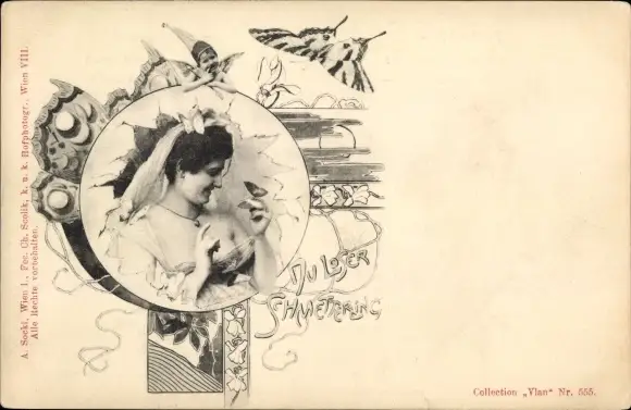Ak Portrait einer Frau, Schmetterlinge, Kitsch