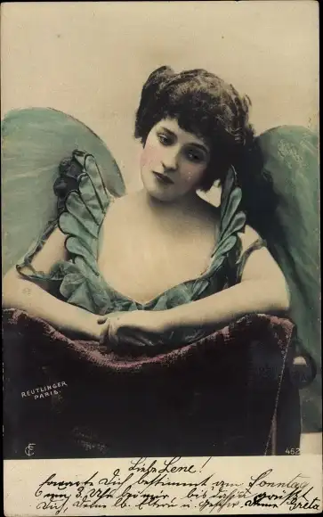 Ak Portrait einer Frau in Gedanken versunken, Grünes Kleid