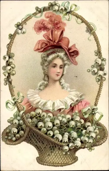 Ak Portrait einer Frau mit Hut, Korb, Maiglöckchen
