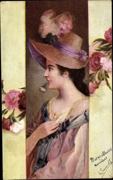 Ak Portrait einer Frau mit Strohhut, Nelken