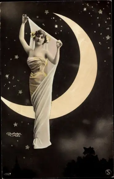Ak Portrait einer Frau vor der Mondsichel, Sternenhimmel