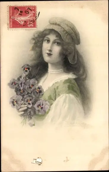 Ak Portrait einer jungen Frau mit Stiefmütterchen