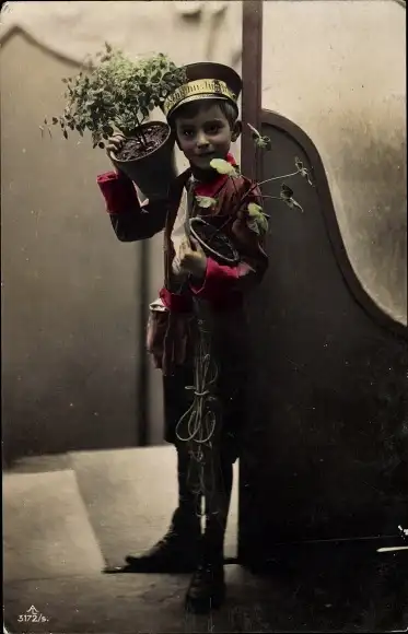 Ak Portrait eines Jungen in Uniform, Blumentöpfe
