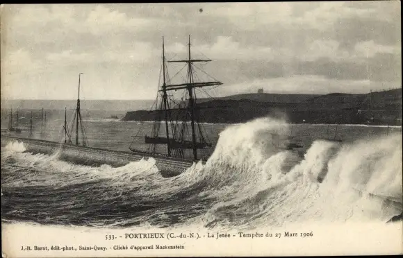 Ak Portrieux Cotes d'Armor, La Jetee, Tempete du 27 Mars 1906
