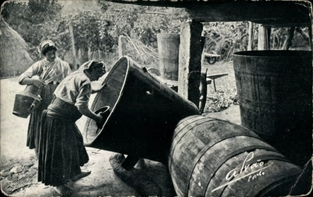 Ak Portugal, zwei Frauen in Tracht, Fässer