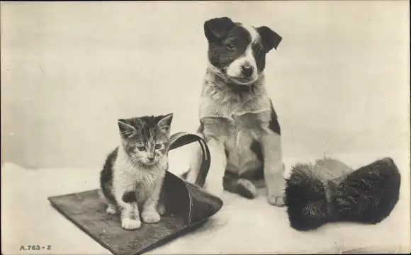 Ak Potrait eines Terriers und einem Katzenbaby