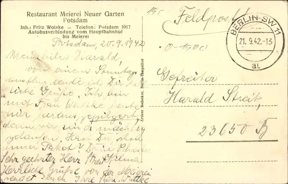 Zustand, siehe Scan, gelaufen, 1942- Inh. Fitz Wolske - ca 14 cm X 9 cm