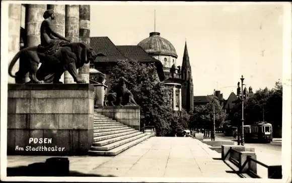 Ak Poznań Posen, Am Stadttheater, Straßenbahn