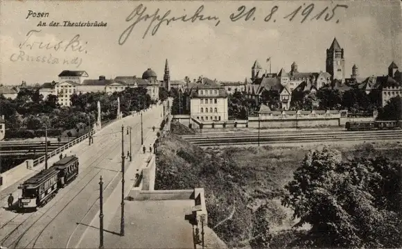 Ak Poznań Posen, An der Theaterbrücke, Straßenbahn
