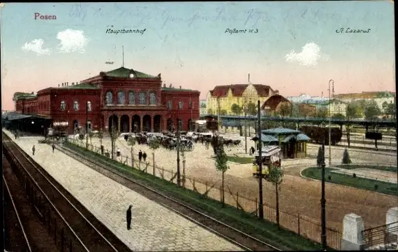 Ak Poznań Posen, Hauptbahnhof, Gleisseite, St. Lazarus, Postamt W 3