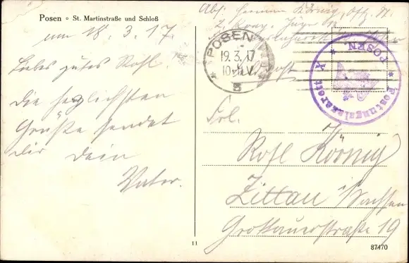 Ak Poznań Posen, St. Martinstraße und Schloss