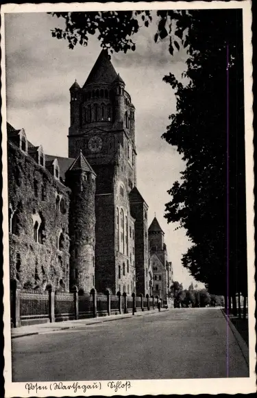 Ak Poznań Posen, Straßenpartie vor dem Schloss, Turmuhr