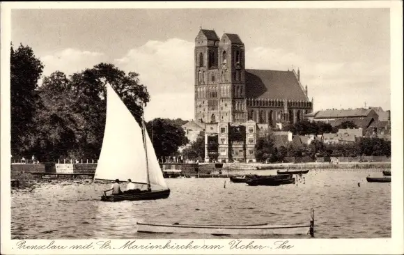 Ak Prenzlau in der Uckermark, Marienkirche, Ückersee, Segelboot
