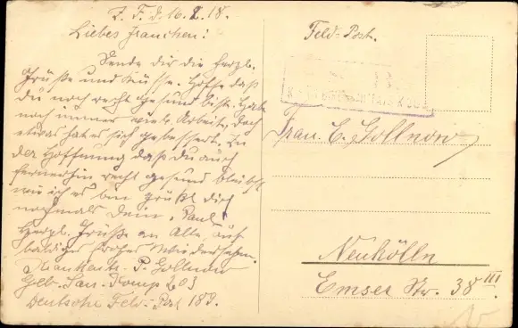 gelaufen als Feldpost 1918, Eckknick rechts unten, sonst guter Zustand