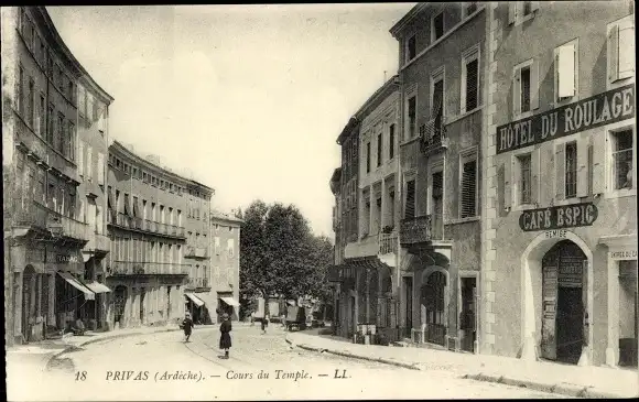 Ak Privas Ardèche, Cours du Temple, Hotel du Roulage, Cafe Espic
