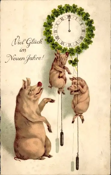 Ak Prosit Neujahr, Schweine, Wanduhr, 12 Uhr, Klee