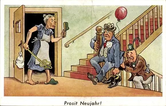 Ak Prosit Neujahr, Verärgerte Hausfrau, Betrunkene Männer