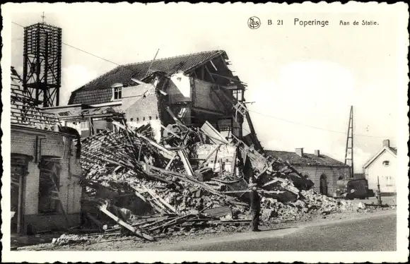 Ak Proven Poperinge Westflandern, Zerstörtes Haus, Ruine, Trümmer