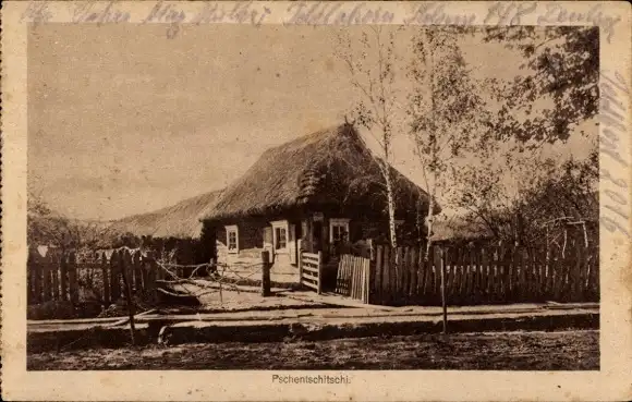 Ak Pschentschitschi Russland, Bauernhaus, Straße