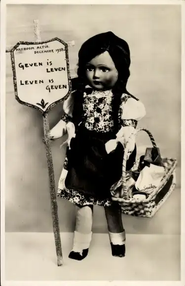 Ak Puppe, Spielzeug, Korb, Informationsschild