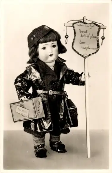 Ak Puppe mit Koffer und Schild