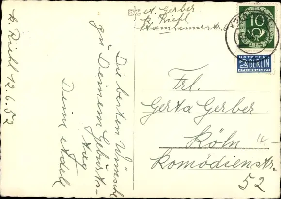 gelaufen 1952, Eckknick rechts unten, sonst guter Zustand