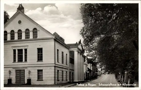 Ak Putbus auf der Insel Rügen, Schauspielhaus mit Alleestraße