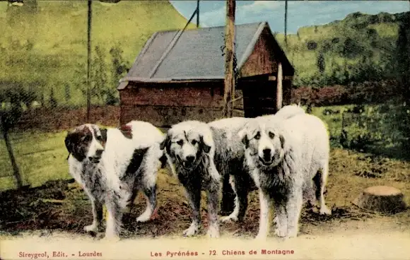 Ak Pyrenäen-Berghunde, Hunde stehen vor einer Hütte.