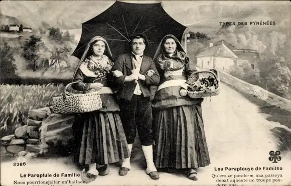Ak Pyrenäen, Mann und zwei Frauen in Volkstrachten