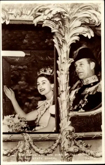 Ak Queen Elizabeth II. and the Duke of Edinburgh in the State Coach, Coronation 1953