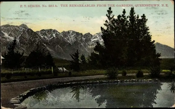 Ak Queenstown Neuseeland, The Remarkables from the Gardens