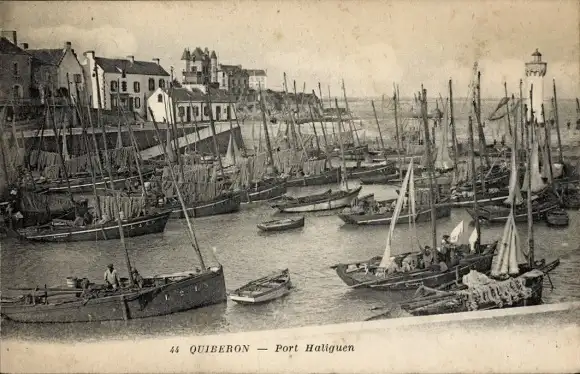 Ak Quiberon Morbihan, Hafenansicht, viele Boote, Gebäude im Hintergrund, Leuchtturm