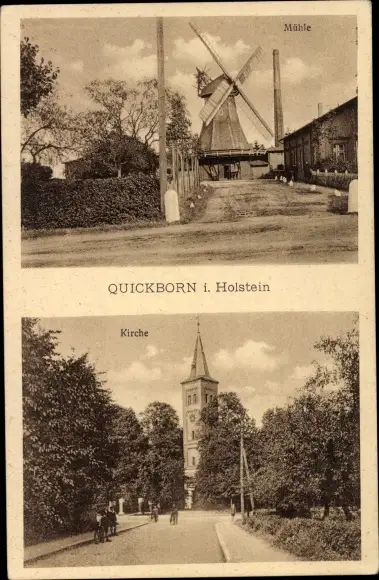 Ak Quickborn in Holstein, Windmühle, Kirche