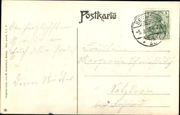 gelaufen 1908, Eckknick rechts unten, sonst guter Zustand