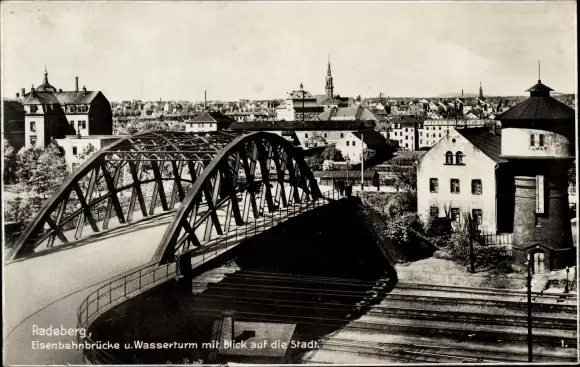 Ak Radeberg in Sachsen, Eisenbahnbrücke, Wasserturm, Blick auf den Ort