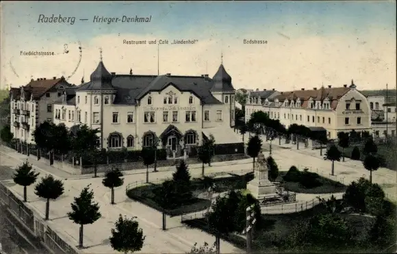 Ak Radeberg in Sachsen, Kriegerdenkmal, Friedrichstraße, Restaurant Lindenhof, Badstraße