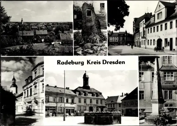 Ak Radeburg in Sachsen, Panorama, Ratskeller, Brunnen, Cafe, Denkmal