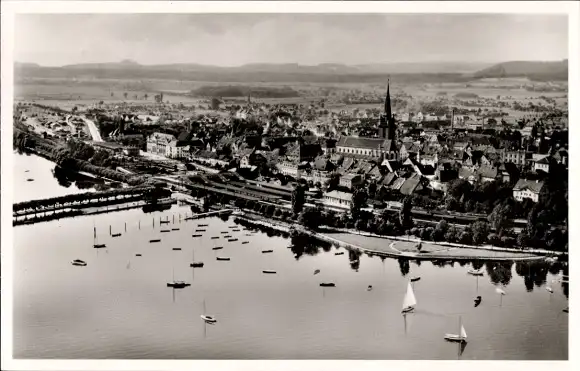 Ak Radolfzell am Bodensee, Luftaufnahme, Stadtansicht, Bodensee, Boote, Kirche, Landschaft