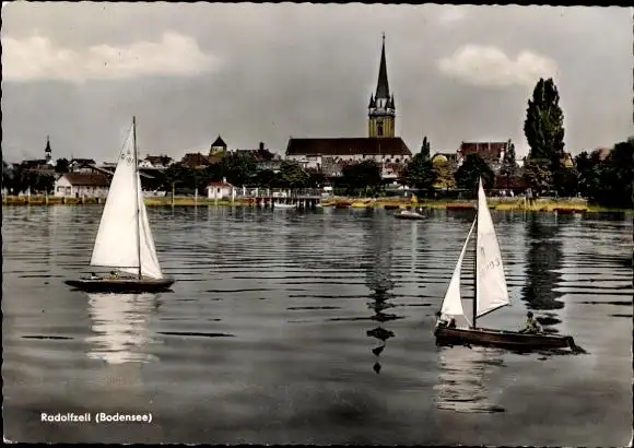 Ak Radolfzell am Bodensee, Teilansicht, Kirchturm, Segelboote