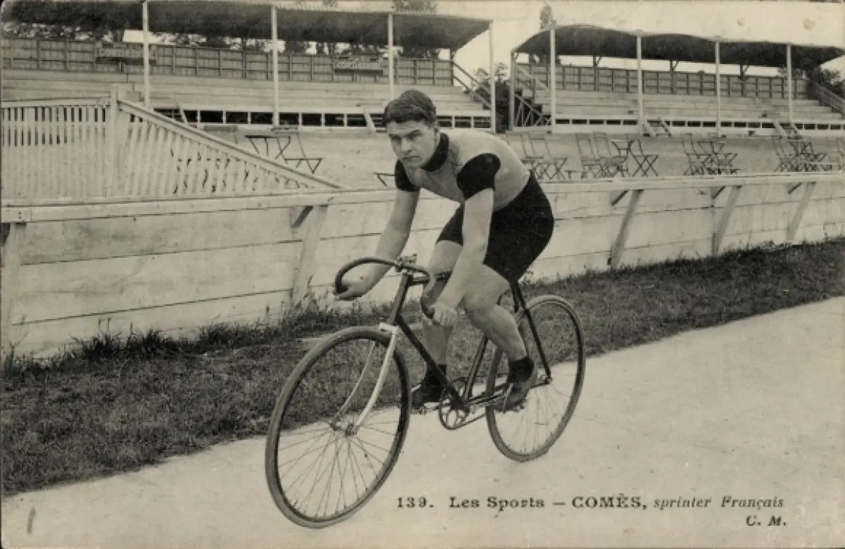 Ak Radrennfahrer Comès, französischer Sprinter, auf einer Radrennbahn